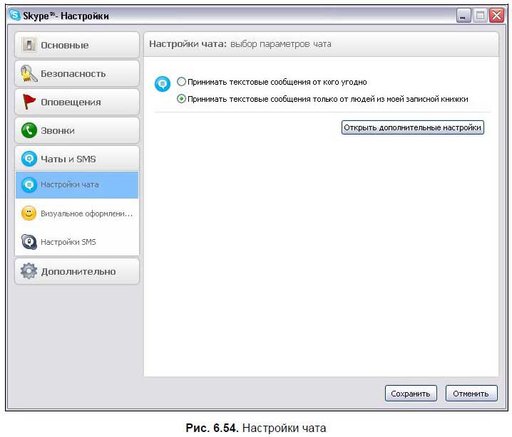 Иногда эти предложения могут надоедать, тогда нужно изменить настройки чатов. Для этого используется команда основного меню программы Skype Инструменты | Настройки… Перейдите на вкладку Чаты и SMS , затем на подвкладку Настройки чата (рис. 6.54). Установите переключатель напротив позиции Принимать текстовые сообщения только от людей из моей записной книжки.