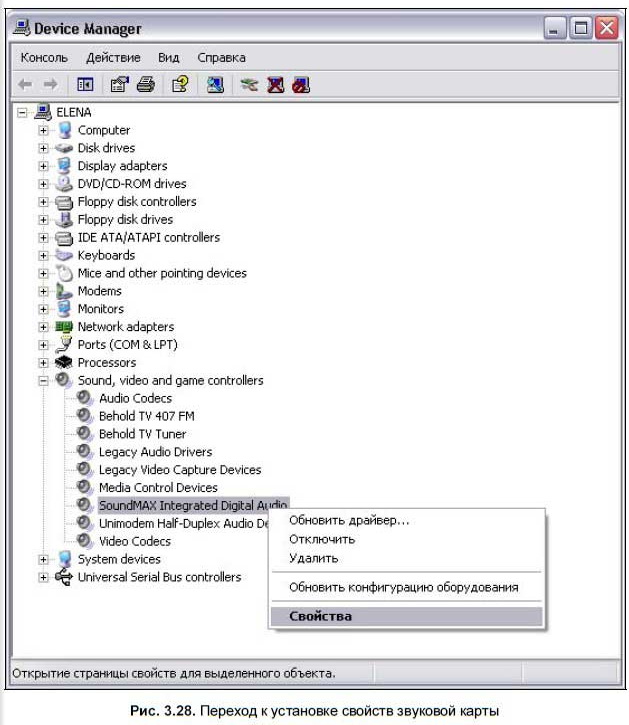 4. В списке доступных звуковых, видео‑ и игровых устройств выберите звуковую карту. Щелкните на ее названии правой кнопкой мыши и в контекстном меню выберите команду Свойства (рис. 3.28).