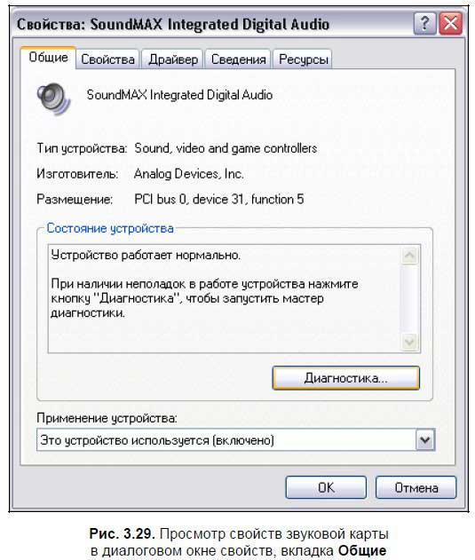 5. Открывшееся диалоговое окно свойств звуковой карты (рис. 3.29) предназначено для проверки работоспособности устройства, диагностики неисправностей, добавления и обновления драйверов и т. д. Чтобы провести тест устройства и определить неполадки, нажмите кнопку Диагностика , расположенную на вкладке Общие в поле Состояние устройства .